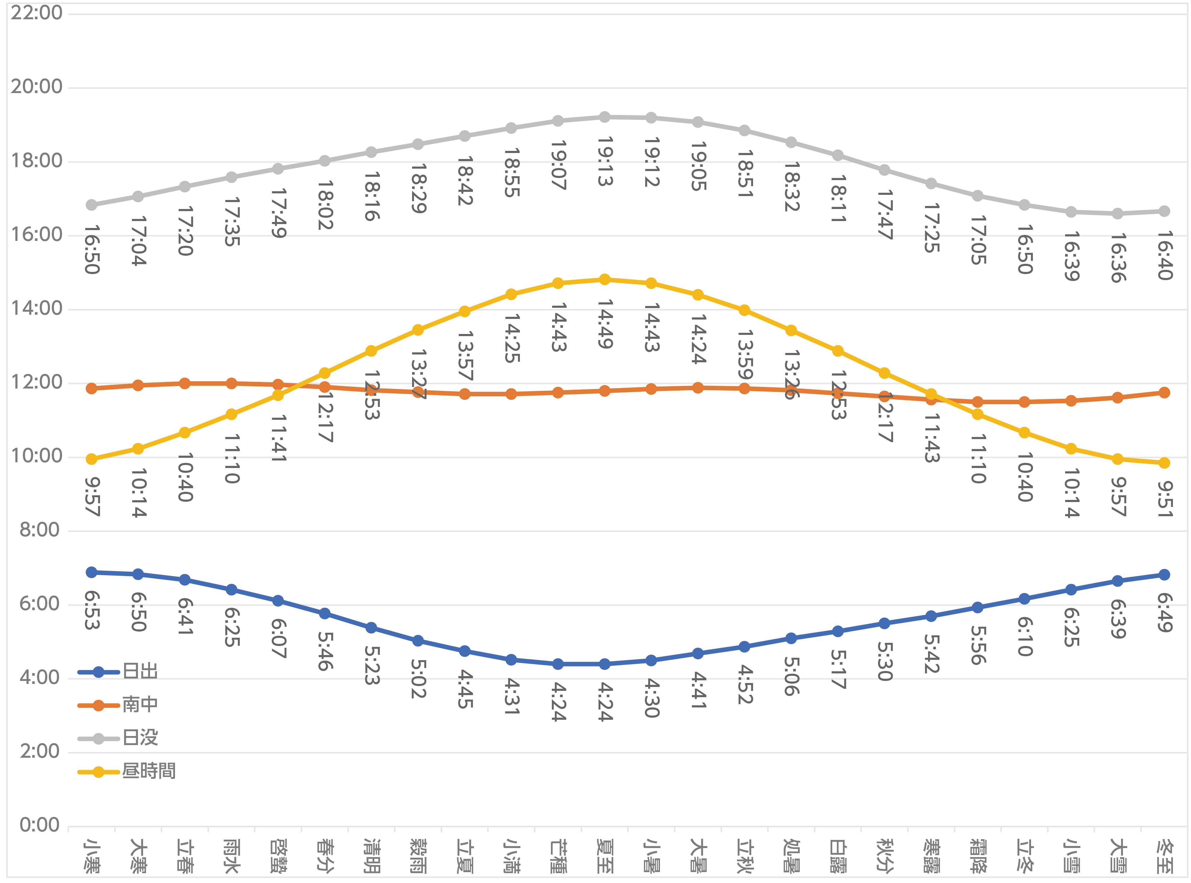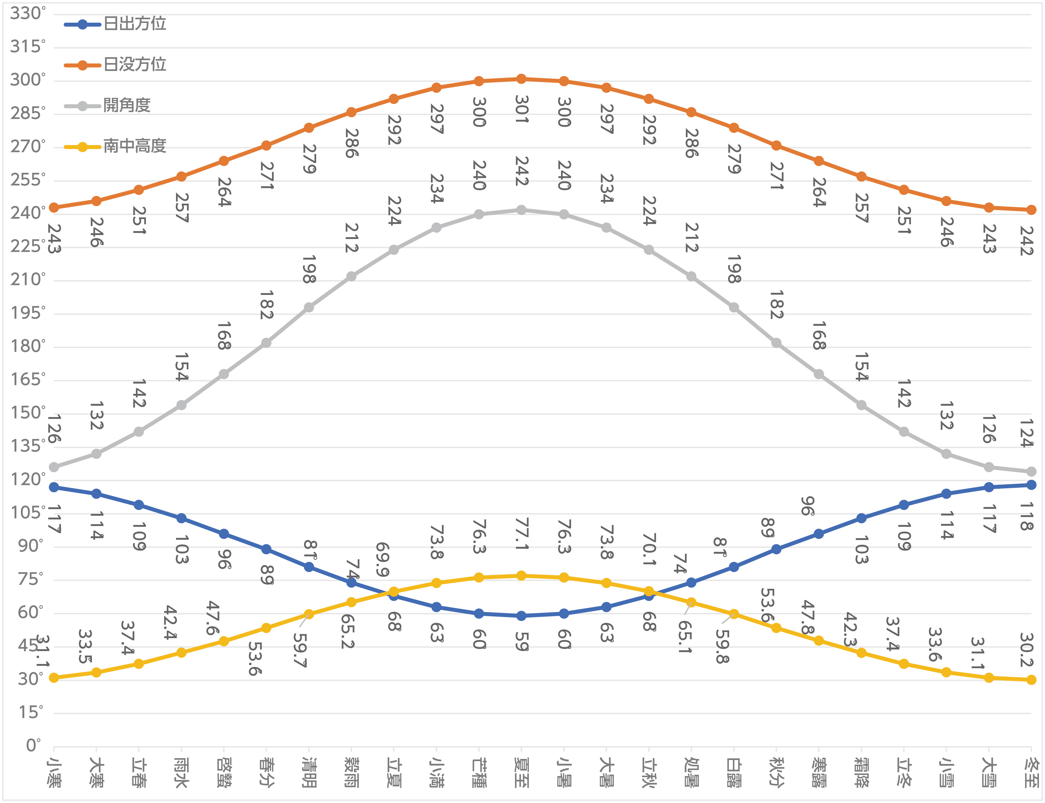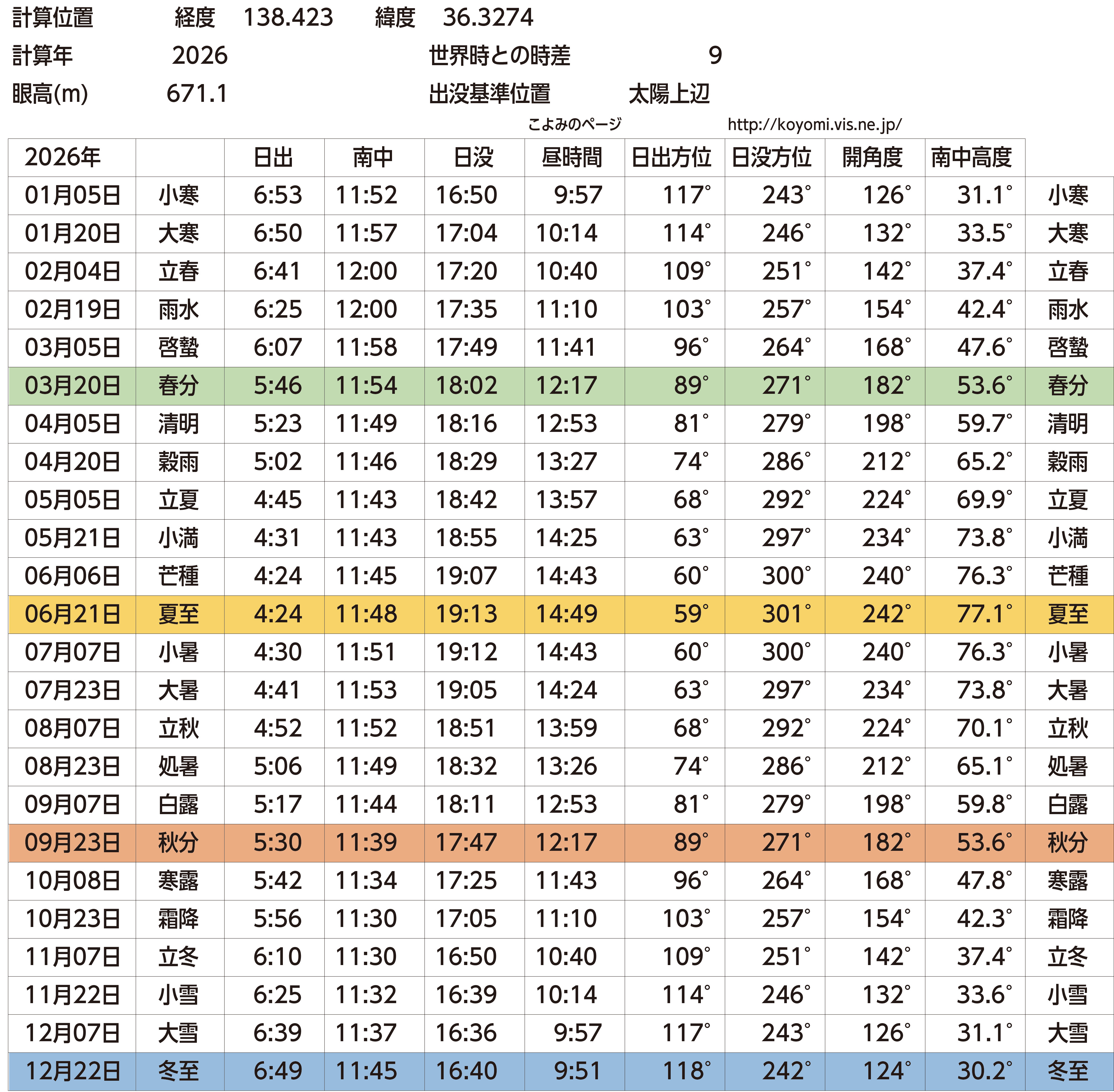 表は、小諸の緯度経度から、二十四節気ごとに太陽の日出、日没などの角度やその時間について。